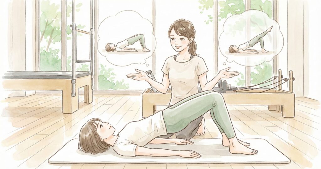・意識の誘導:最小限の動きで、エクササイズの核となる感覚や筋肉の繋がりを体感してもらう。