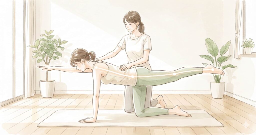 ピラティスは、体幹から手足へ動きが伝わる感覚を育むことが大切です。